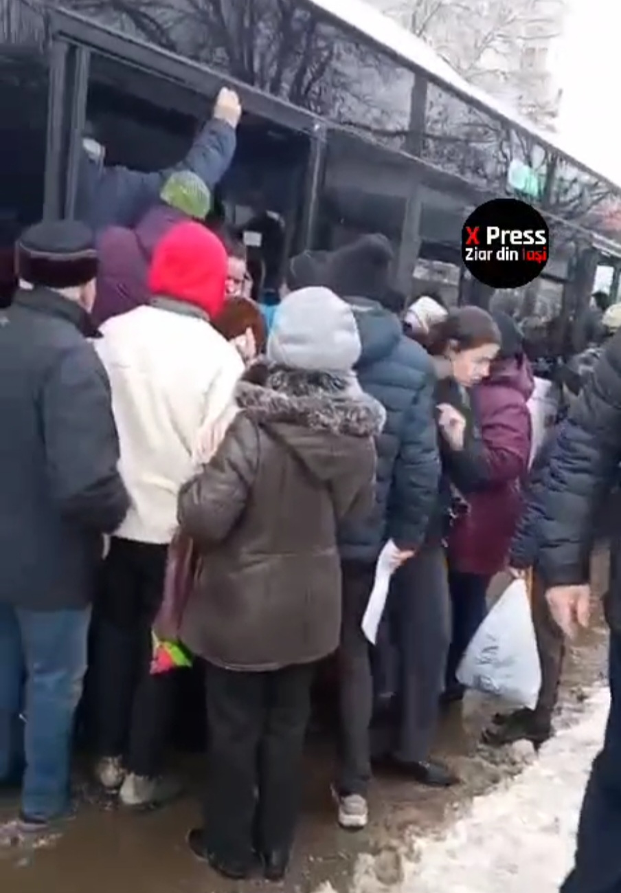 Imaginile de mai sus sunt din Iași și se poate vedea disperarea călătorilor care vor cu orice preț să se urce în autobuz, chiar dacă mijlocul de transport este plin, ca într-o conservă.