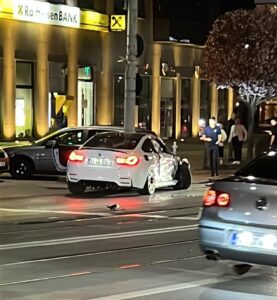Aseară, șoferul unui autoturism BMW care circula dinspre Prefectură către Podu Roș a oprit la semaforul din fața Palatului Culturii și ambala zgomotos motorul bolidului. Faptul a fost sesizat și de către un echipaj de polițiști aflați în patrulare într-un autoturism Volkswagen Polo. Aceștia s-au deplasat rapid lângă BMW iar un agent a făcut semn șoferului să oprească. Speriat, șoferul din bolid a apăsat pedala de accelerație și a plecat în trombă, chiar dacă semaforul indica roșu. Polițiștii au plecat în urmărire. Însă, pe strada Palat,în goană și cu poliția pe urmele lui, șoferul din BMW a pierdut controlul volanului, a izbit un autoturism și apoi s-a „înfipt” într-un stălp. Apoi, a dispărut.