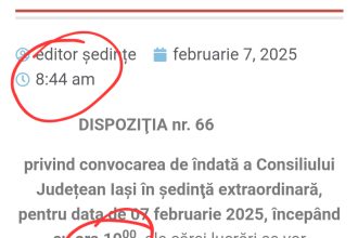 Conducerea Consiliului Județean Iași continuă să organizeze ședințele printr-o procedură controversată, convocându-le în regim extraordinar și anunțându-le cu foarte puțin timp înainte. Un exemplu recent s-a petrecut chiar astăzi, când notificarea privind desfășurarea unei noi ședințe a fost publicată pe site-ul instituției la ora 08:44, în timp ce întâlnirea era programată pentru ora 10:00. Astfel, … Continuă lectura Ședințe pe repede înainte la CJ Iași: Consilierii, anunțați cu doar o oră înainte