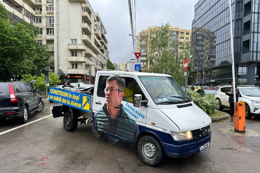 Îmbrăcați în salopete de construcții, tinerii au adus la Consiliul Județean Iași o camionetă încărcată cu tablă, un gest simbol. Pe când era ministru al Mediului, Alexe Costel a luat mită 22 de tone produse siderurgice de la un combinat din Galați.