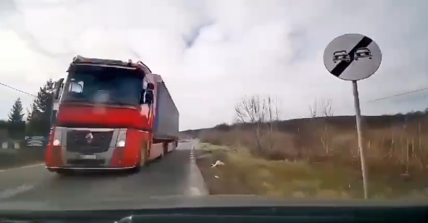 În clipul postat pe rețelele sociale se poate observa faptul că TIR-ul intrase pe sensul opus pentru a depăși două utilaje care efectuau lucrări pe marginea șoselei.